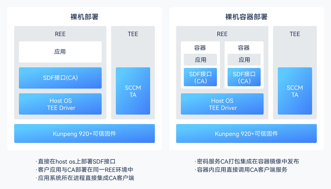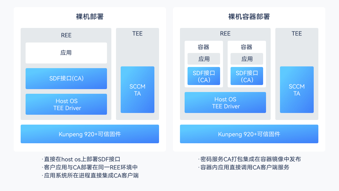 安全计算密码模块(SCCM)的部署,当前版本支持裸机部署以及裸机容器部署。后续版本将支持虚拟化部署以及虚机容器部署。