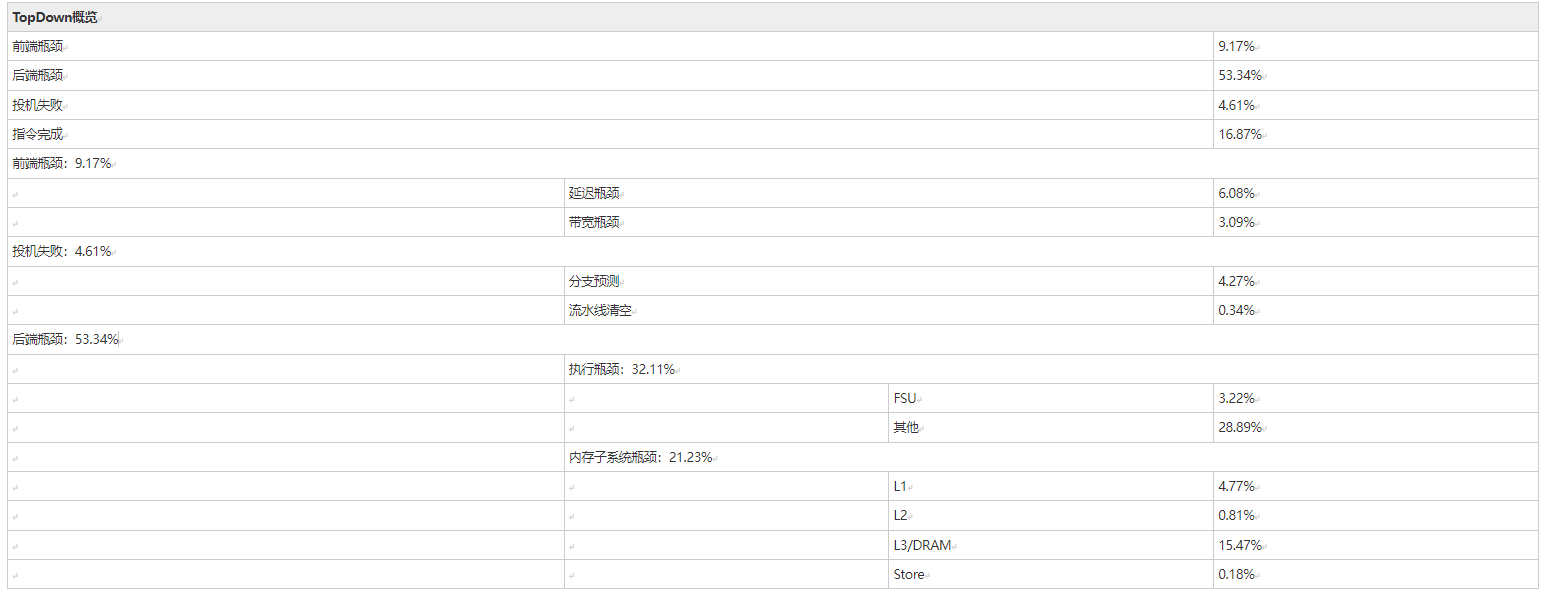 TopDown分析,当前瓶颈在后端瓶颈,其中内存子系统瓶颈占比21%(其中L3/DRAM为15.47)。可通过开启CPU预取提高性能(当前环境已开启)。