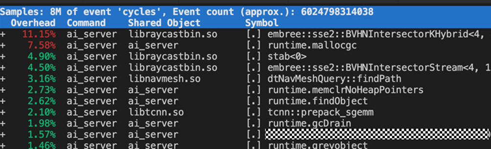 获取perf top分析,主要热点在embree相关函数intersect(11.15%)、occluded(4.5%),共计15.65%。其次为GO GC相关热点mallocgc(7.58%)、memclrNoHeapPointers(2.73%)、findObject(2.62%)、gcDrain(1.98%)、greyobject(1.46),共16.37%。