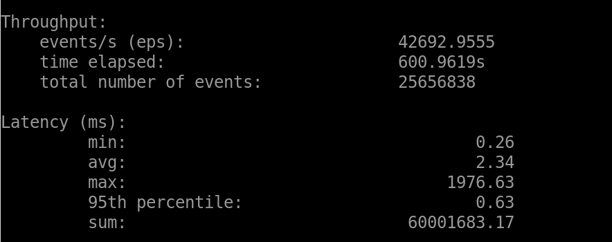./sysbench --db-driver=dm --dm-db=localhost:15236 --dm-user=SYSDBA --dm-password=SYSDBA --table_size=25000 --tables=250 --events=0 --time=600   --threads=2048 --percentile=95 --range-selects=0 oltp_read_only cleanup