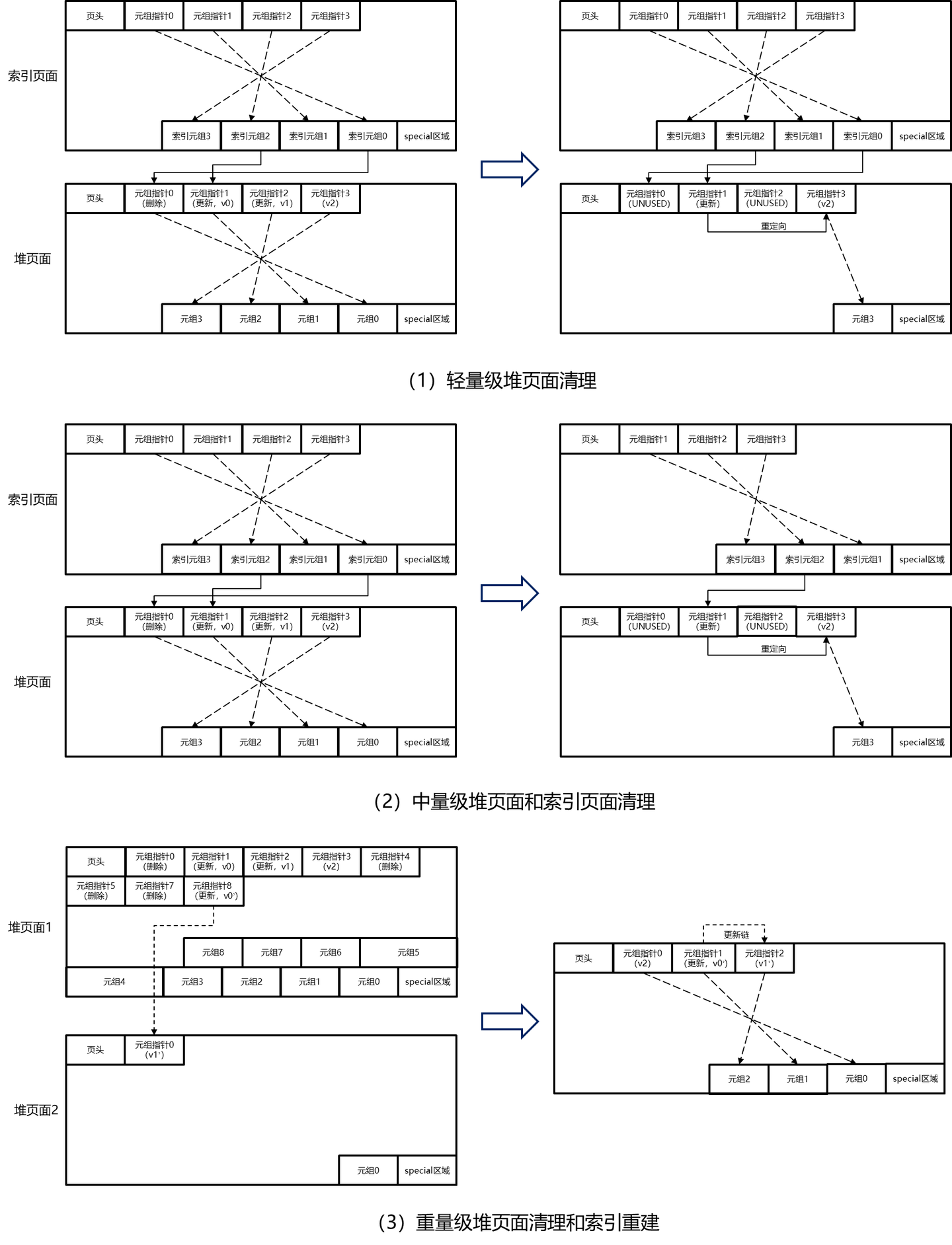 为了解决上述这些问题,openGauss当前提供了三种空间管理和回收的机制(参见4.2.3.5小节)。在对astore堆表进行轻量级清理时,无法清理索引中的垃圾数据。只有对astore进行中量级VACUUM清理,或者重量级VACUUM FULL清理时,才能够清理对应索引中的垃圾数据。