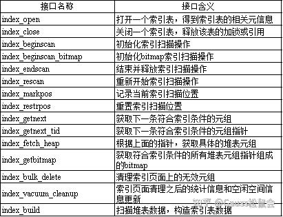 和堆表存储接口不同,由于openGauss支持多种索引结构(B-Tree,hash,GIN(generalized inverted index,通用倒排索引)等),每种索引结构内部的页面间组织方式以及扫描方式都不太相同,因此在上述接口中,没有直接定义底层的页面和元组操作,而是进一步调用了各个索引自己的访存方式。不同索引的底层访存接口,可以在pg_am系统表中查询得到。