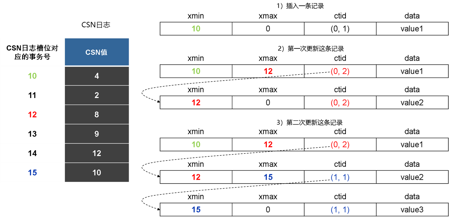 (3) t_cid,插入或删除元组的命令号。对应系统字段序号MinCommandIdAttributeNumber(-4)和MaxCommandIdAttributeNumber(-6)。