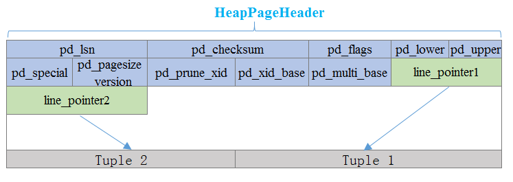 在一个astore堆表页面中,页面头部分对应HeapPageHeaderData结构体。其中,pd_multi_base以及之前的部分对应定长成员,存储了整个页面的重要元信息;pd_multi_base之后的部分对应元组指针变长数组,其每个数组成员存储了页面中从后往前的、每个元组的起始偏移和元组长度。如图4所示,真正的元组内容从页面尾部开始插入,向页面头部扩展;相应的,记录每条元组的元组指针从页面头定长成员之后插入,往页面尾部扩展;整个页面中间形成一个空洞,供后续插入的元组和元组指针使用。