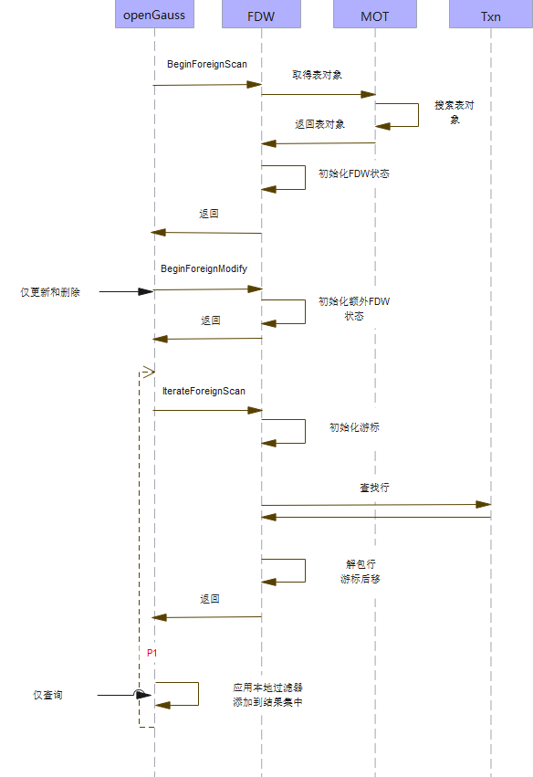 正常事件流:openGauss调用BeginForeignScan,FDW检索相关表并初始化查询的FDW状态。在进行UPDATE/DELETE操作时,openGauss通过调用BeginForeignModify接口触发一个额外的初始化阶段,然后返回NULL。openGauss通过调用IterateForeignScan接口进行如下操作:①仅在需要时一次性初始化游标;②在当前事务对象中查找下一行;③将行数据从MOT格式转换为openGauss格式;④游标前进;⑤返回包含unpack行的槽位。重复此过程,直到游标中不再有行,并且返回NULL到openGauss。然后openGauss应用本地条件/查询子句等本地过滤器来决定是否继续处理该行。在进行SELECT操作时,该行将被添加到结果集中,并返回结果集给用户。进行UPDATE和DELETE操作需执行的其余部分将在后文中进行描述。