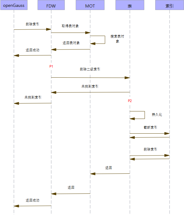正常事件流:FDW从MOT引擎中检索表对象,并转发从表中删除二级索引的请求。DDL命令在重做日志中持久化,然后截断索引数据并删除索引对象。