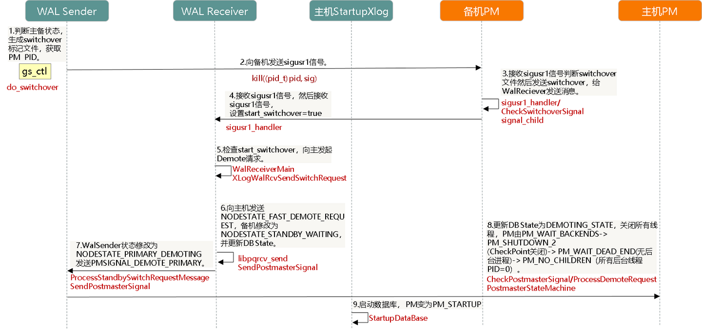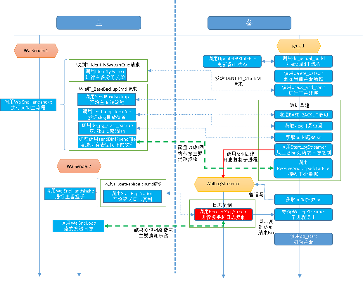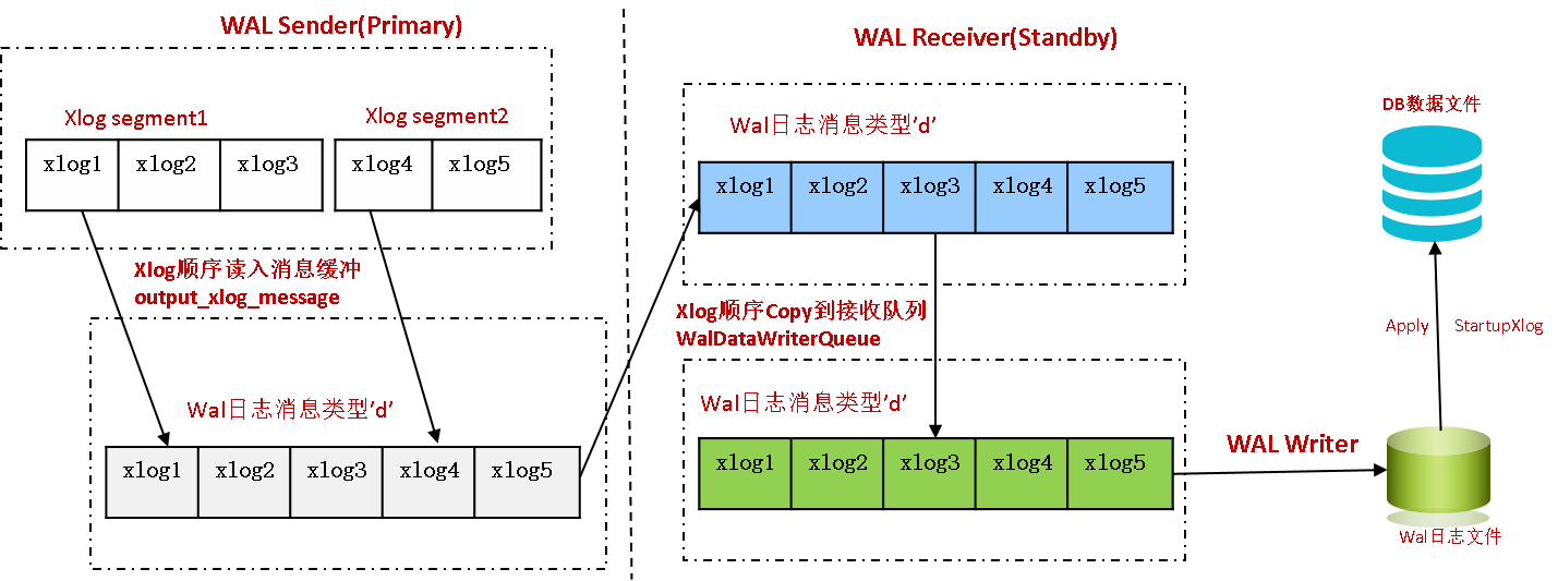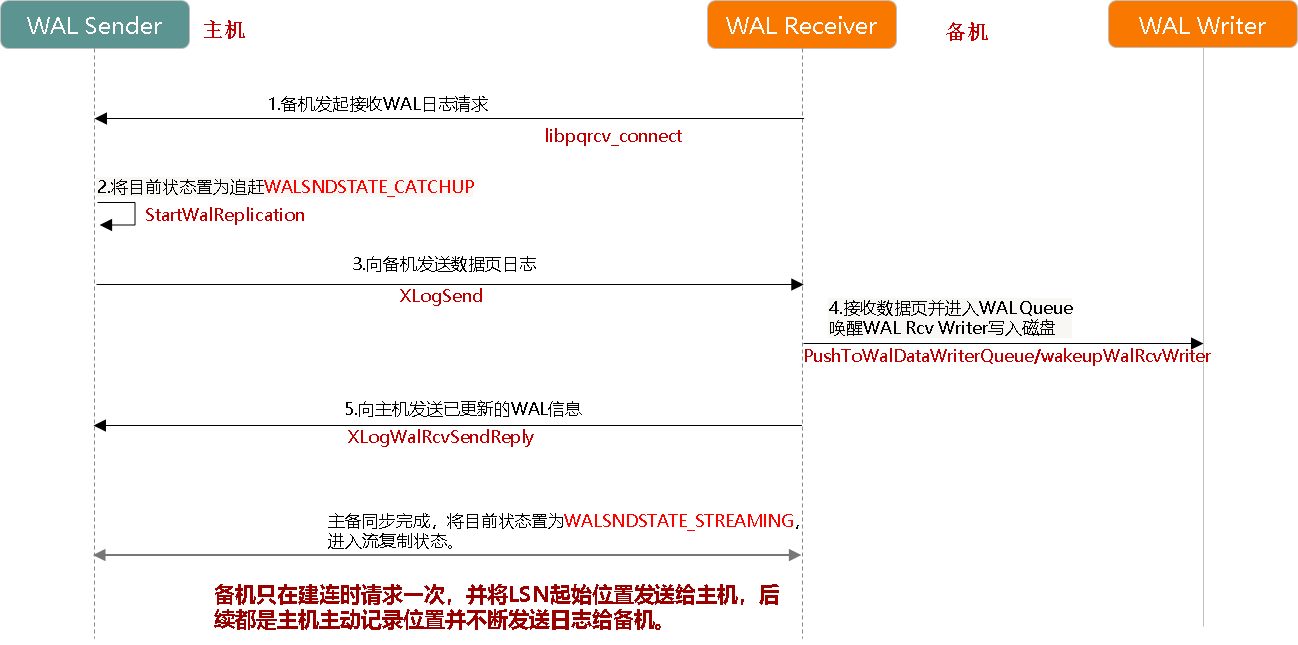 参与日志同步的主要有“wal sender”(主机端)和“wal receiver”(备机端)两个线程。一个主机上可以由多个“wal sender”线程同时存在,用于给不同的备机进行日志复制;一个备机上同一时刻只会有一个“wal receiver”线程,从唯一一个指定的主机上拷贝日志。