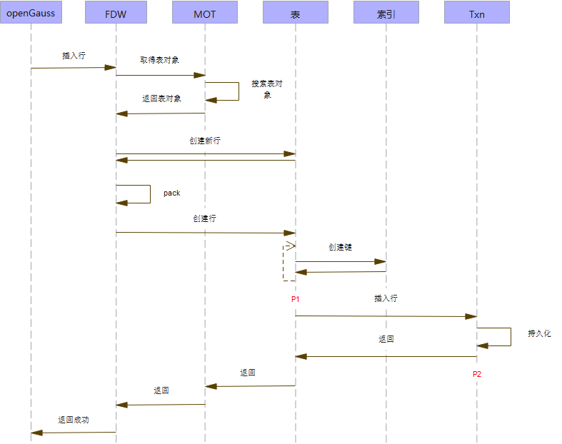 正常事件流:FDW从MOT引擎中检索表对象并创建新的行对象。由于内存引擎不同于磁盘引擎,不使用基于页面的间接访问形式,因此需要将行格式从openGauss行格式转换为MOT行格式(MOT将这种行格式转换称为Pack,反向转换称为unpack)后才能插入到表中。随后为该表的每个索引创建一个键。插入行的整个请求被传递到当前Txn,随后将该请求转发到并发控制模块,并持久化到重做日志。