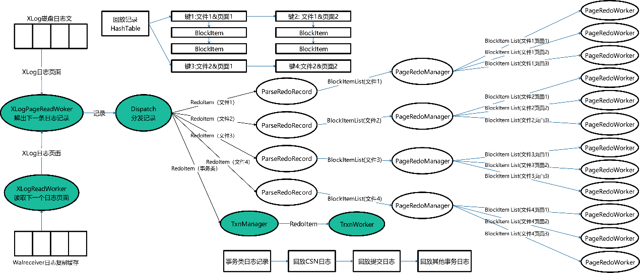 (1) “Walreceiver”线程收到日志成功写入磁盘后,“XLogReadWorker”线程从“Walreceiver”线程的buffer中读取字节流,“XLogReadManager”线程将字节流decode(解码)成redoitem(单个回放对象)。“Startupxlog”线程按照表文件名粒度(refilenode)将redoitem发放给各个“ParseRedoRecord”线程,其他的日志发送给“TrxnManager”线程。