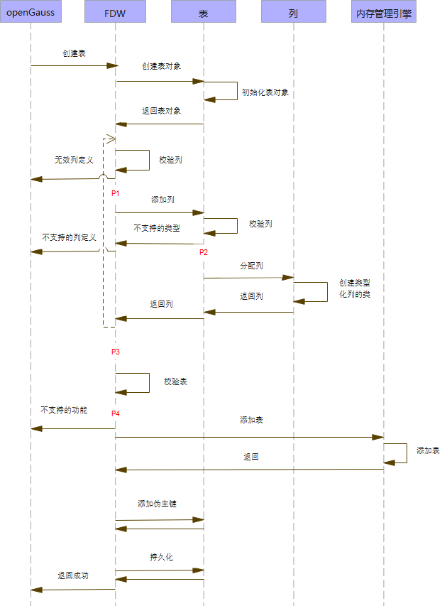用户创建一个新的内存表时,openGauss通过FDW适配器将请求转发给MOT存储引擎。创建表的正常流程和主要异常流程如图11所示。