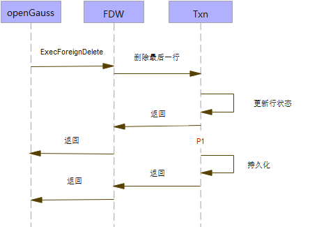 正常事件流:openGauss为特定更新的元组调用ExecForeignDelete接口。FDW更新当前事务对象中最后一行的状态以进行并发控制,然后将操作持久化到重做日志中,并返回openGauss。