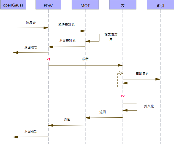 如图15所示,用户截断现有的内存表内容时,openGauss通过FDW适配器将请求转发给MOT存储引擎。