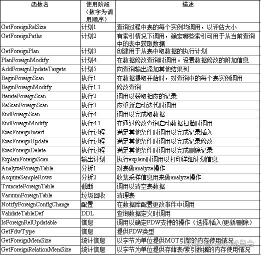 MOT消费者层FDW API的功能和用途如表2所示。其中,计划、执行阶段请参考《查询/更新/删除(计划阶段)》以及《查询/更新/删除(执行阶段)》两小节。