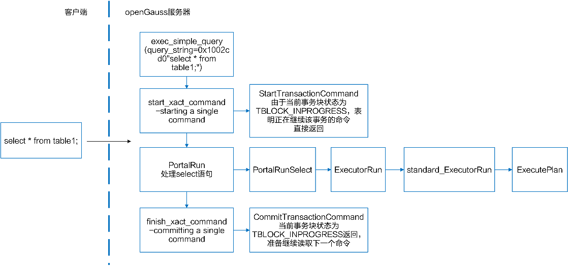 (2) start_xact_command函数开始一个query命令,调用StartTransactionCommand函数,此时事务块上层状态未TBLOCK_DEFAULT,继续调用StartTransaction函数,设置事务底层状态TRANS_START,完成内存、缓存区、锁资源的初始化后将事务底层状态设为TRANS_INPROGRESS,最后在StartTransactionCommand函数中设置事务块上层状态为TBLOCK_STARTED。