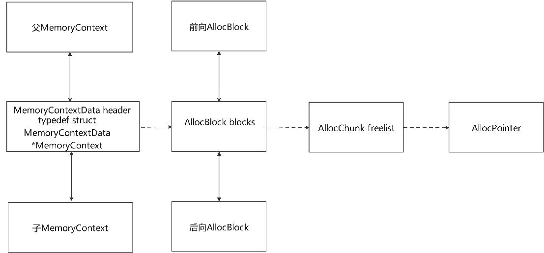 (1) MemoryContext管理上下文之间的父子关系,设置MemoryContext的内存管理函数。