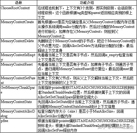 下面先看第1层MemoryContext的实现,主要实现在mcxt.cpp文件中,如表1所示。