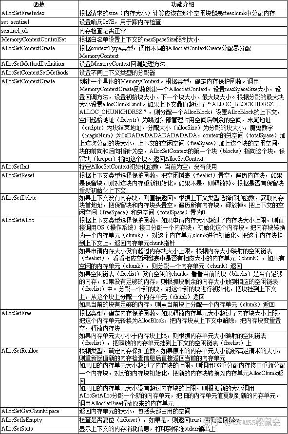 再看第2层AllocSet的实现,主要实现在aset.cpp文件中,如表2所示。