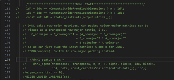 首先从eigen_contraction_kernel.h中删除dnnl相关的接口调用和数据类型,避免在鲲鹏平台编译出未定义的接口错误。代码分别位于dnnl_gemm_kernel和mkldnn_gemm_s8u8s32_kernel的operator()中,图中注释即部分为要删除的代码。