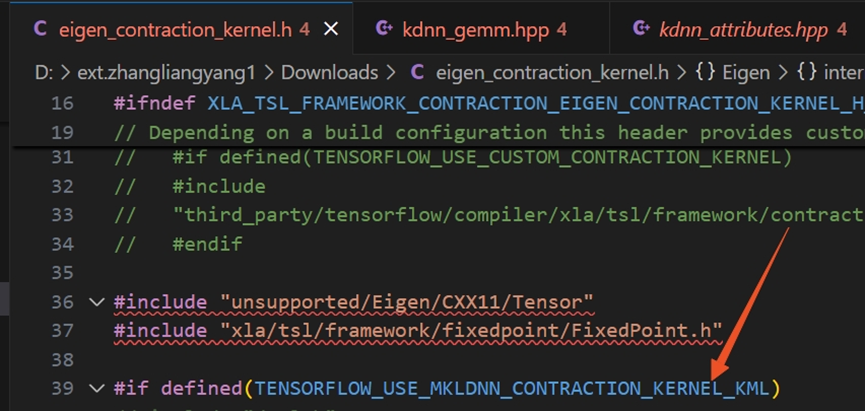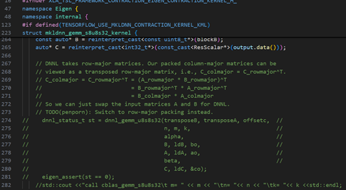我们将基于TensorFlow的XLA框架里Eigen::tensorContract适配oneDNN的代码进行修改,路径位于tensorflow/third_party/xla/xla/tsl/framework/contraction/eigen_contraction_kernel.h。