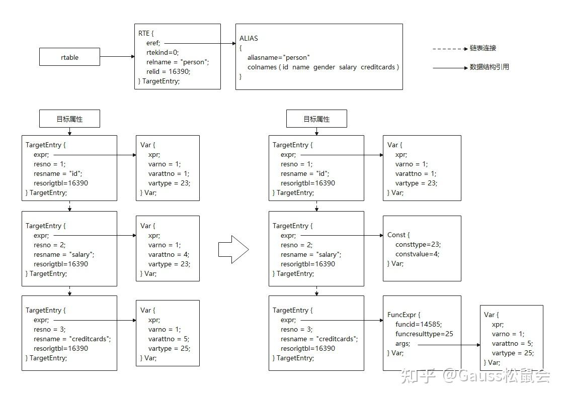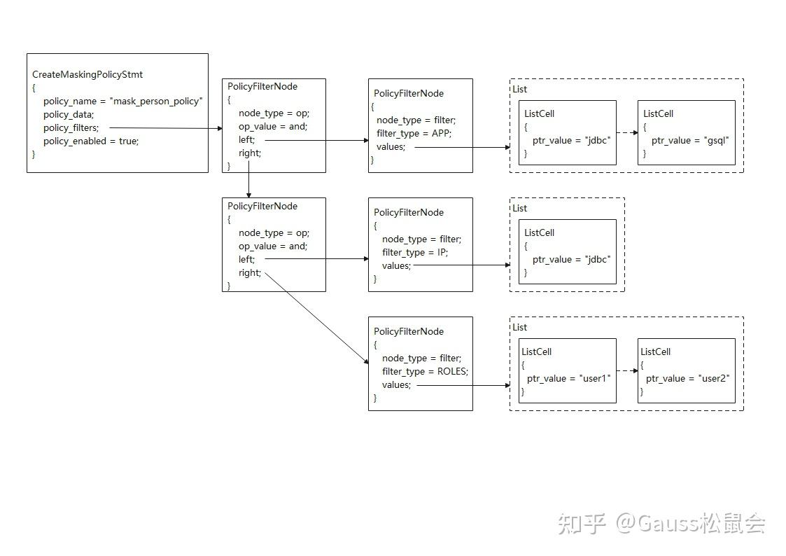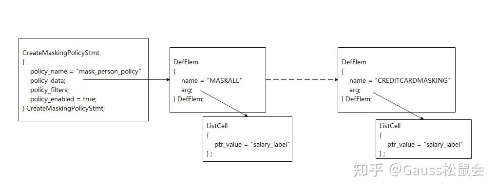 } CreateMaskingPolicyStmt;脱敏策略创建语法是对CreateMaskingPolicyStmt函数进行填充,其中policy_data是由若干DefElem节点组成的List,每个DefElem指出了以何种方式脱敏数据库资源,DefElem->name标识脱敏方法,DefElem->arg代表脱敏对象。