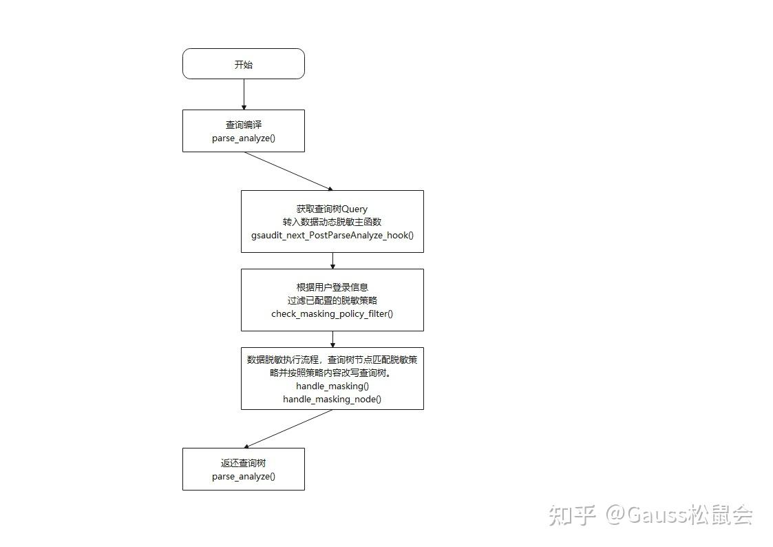 在用户进行数据查询时,数据动态脱敏特性使用openGauss的HOOK机制,将查询编译生成的查询树钩取出来与脱敏策略进行匹配,最后将查询树按照脱敏策略内容改写成不包含敏感数据的“脱敏”查询树返还给解析层继续执行,最终实现屏蔽敏感数据的能力。其执行流程如图5所示。