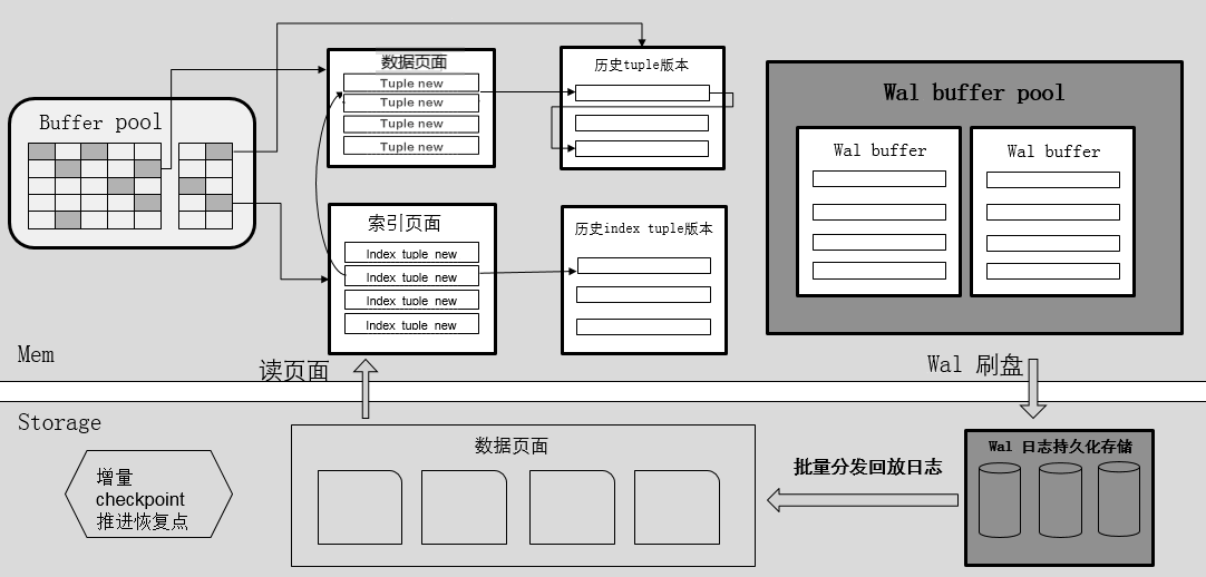 (1)基于CSN(Commit Sequence Number,待提交事务的序列号,它是一个64位递增无符号数)的MVCC并发控制机制,集中式垃圾数据清理。