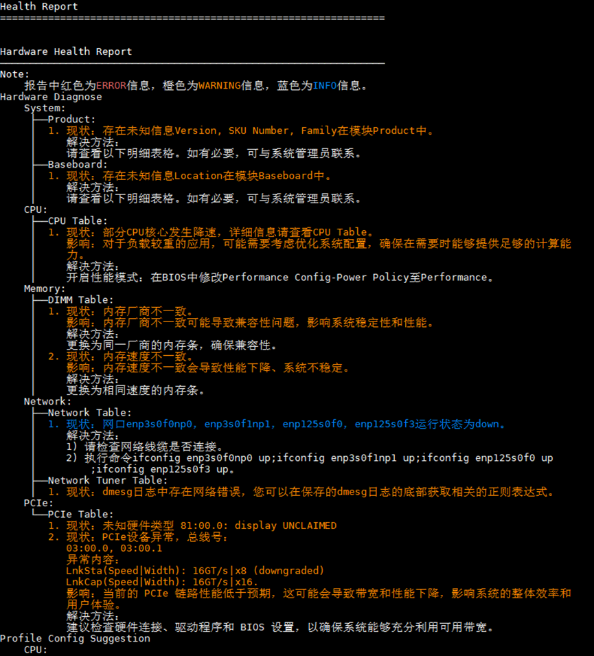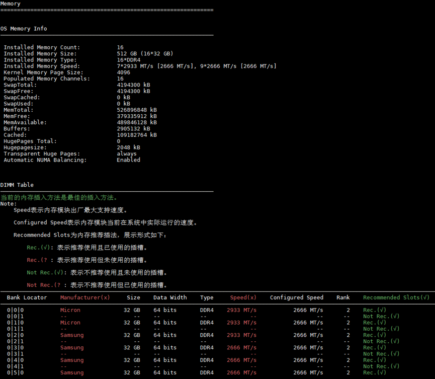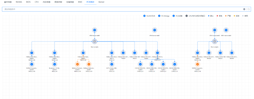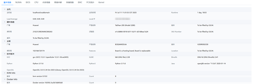 可查看基本信息、NUMA、BIOS、CPU、内存信息、网络中断、存储信息、BMC、PCIe拓扑、Kernel相关信息。