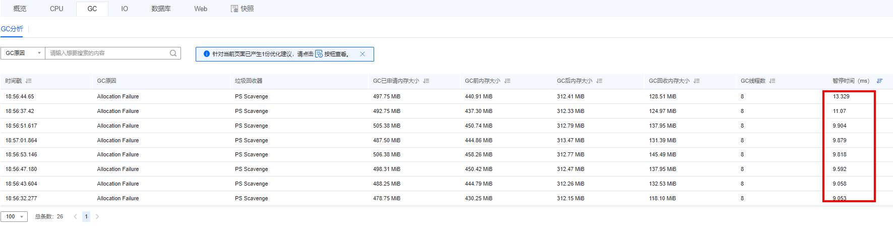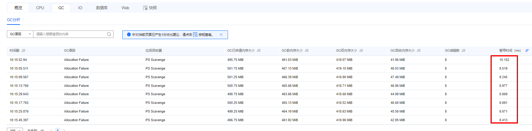 分析java工具采集的GC 活动数据,GC频率比较均匀,垃圾回收耗时也不高,耗时也没有随着并发的增高也明显变大。