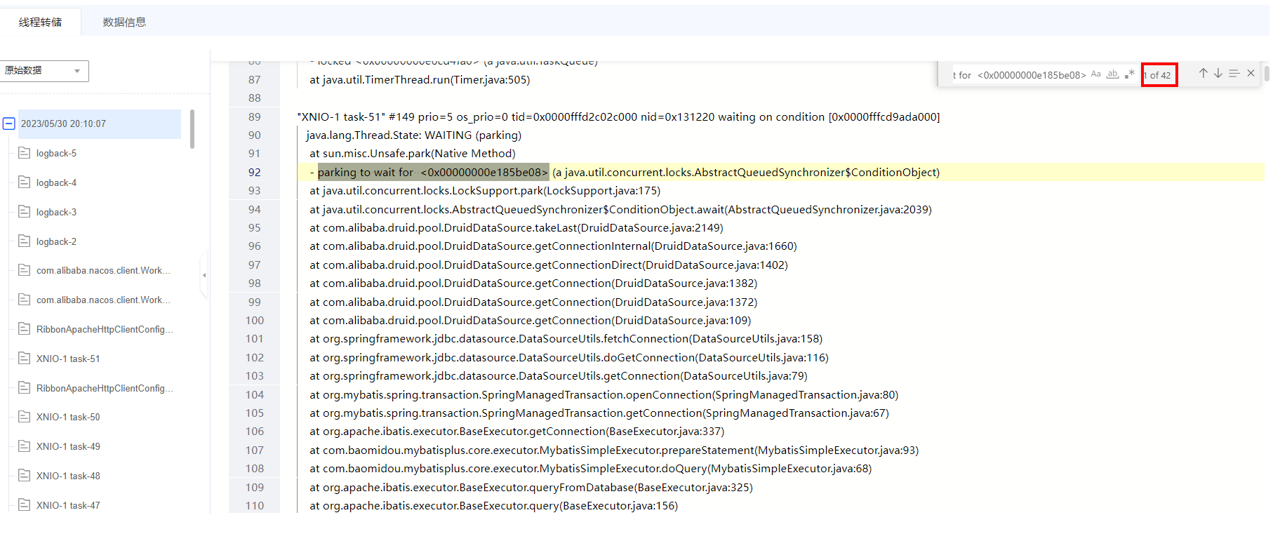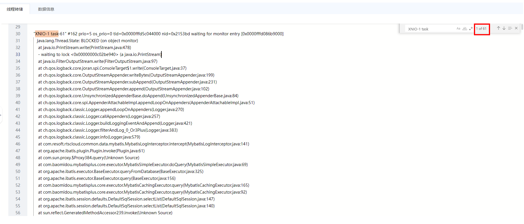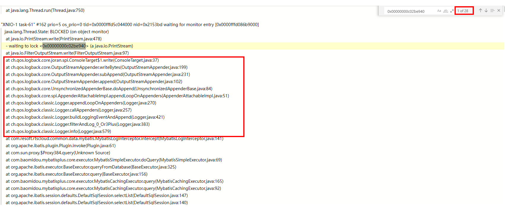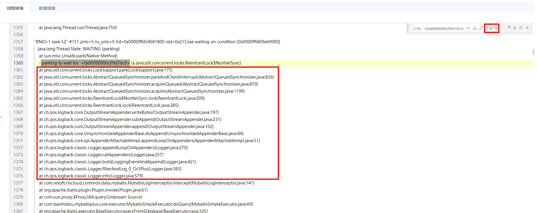 但是等待锁变为了两把,而且都是跟lockback插件打印日志有关,不再是之前的获取数据库连接相关的锁