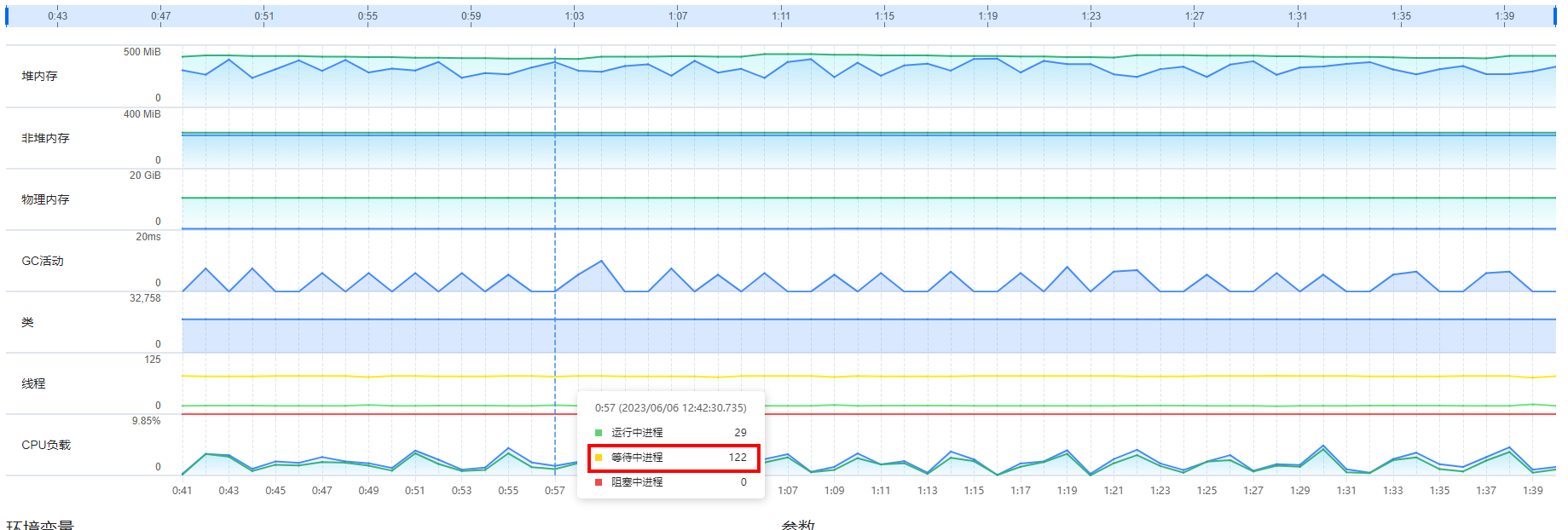 通过java工具在线分析-概览发现,在50并发压测下,程序80% 的线程会处于等待状态