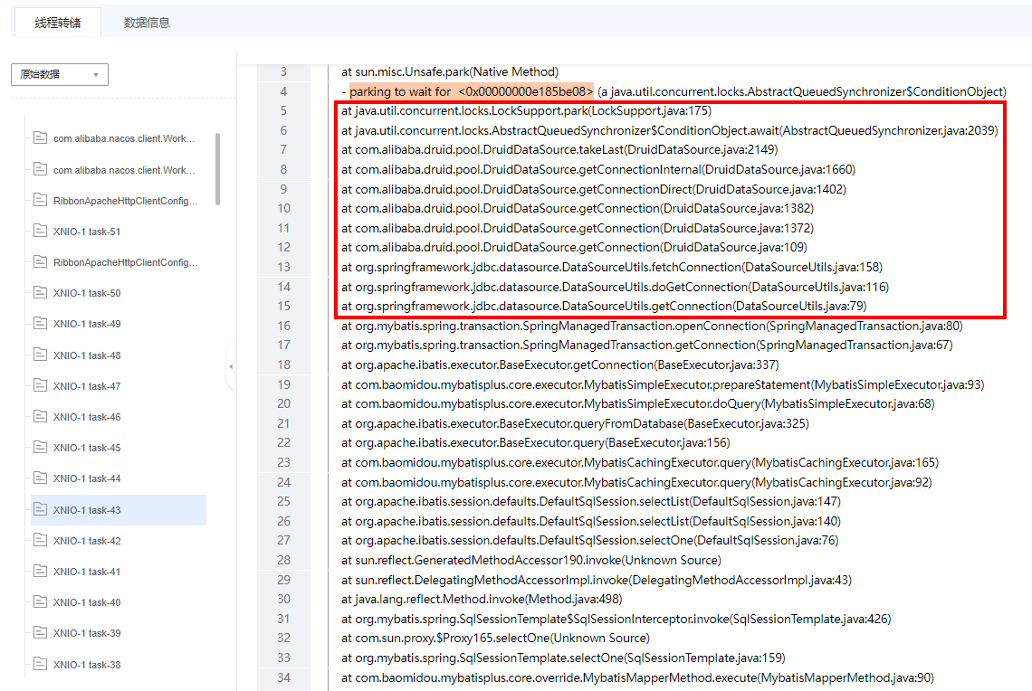 根据调用栈发现这把锁处于从druid数据库连接池中获取数据库连接的操作中。