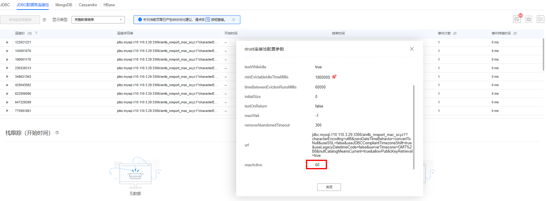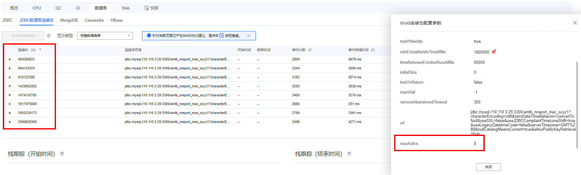 通过采集的数据得知,该应用druid数据库连接池的最大连接为8,它代表这个连接池最多创建8个数据库连接供应用使用。