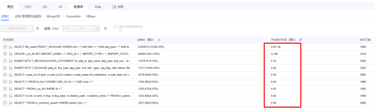 通过java工具采集SQL执行情况,经分析耗时最长的一个SQL查询语句,50并发和单并发对比,耗时增加了0.4s 左右,其他SQL语句耗时基本没变。