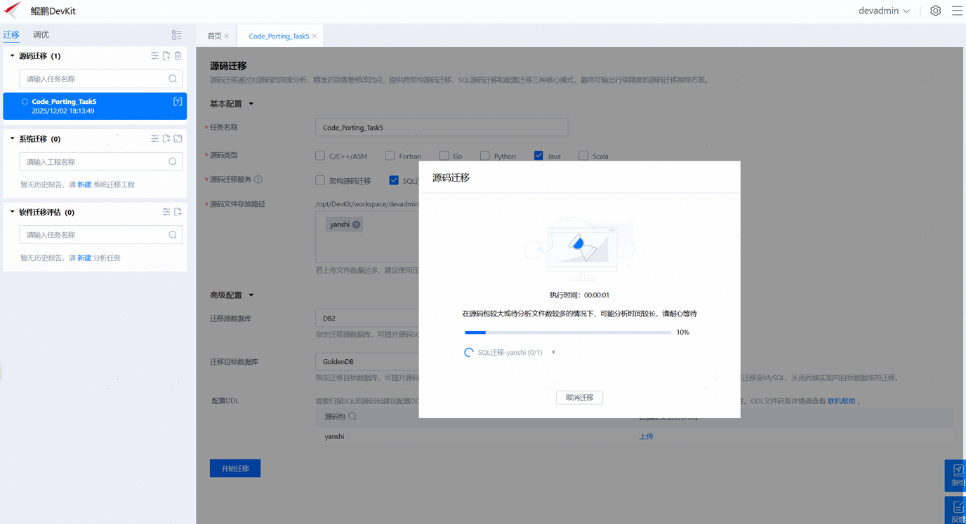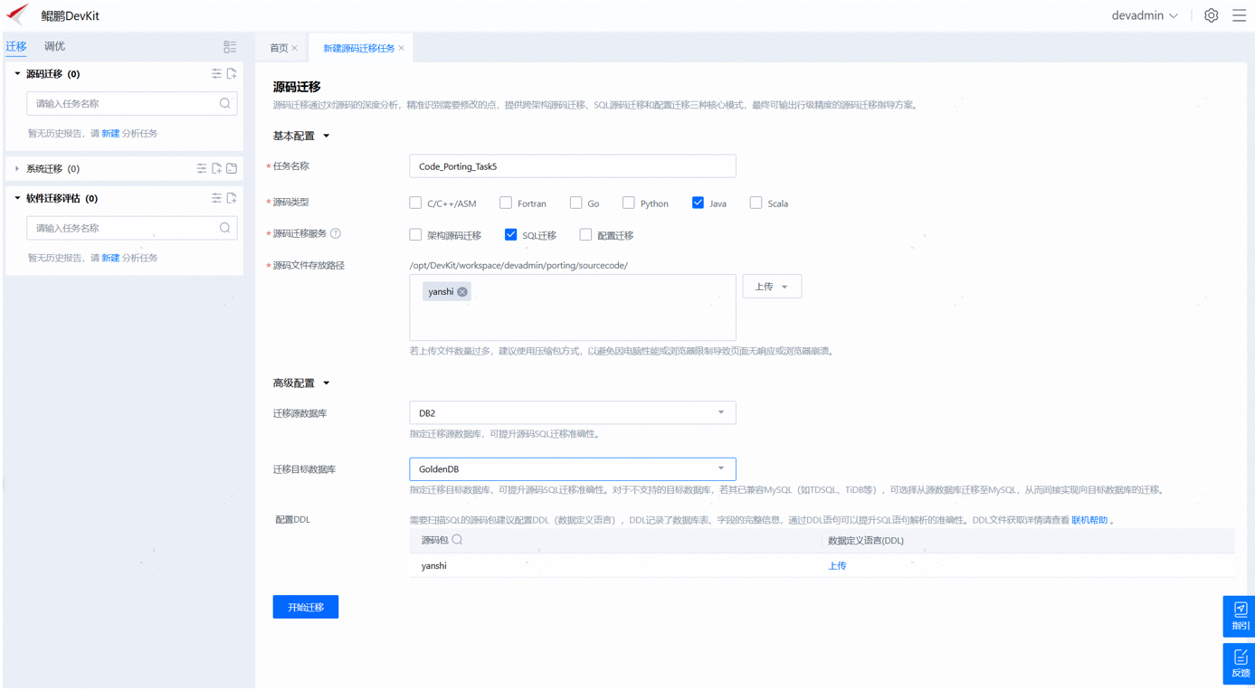 上传待改造源码包,源码类型选择“Java”,源码迁移任务选择“SQL迁移”,在高级配置中,选择迁移源数据库为“DB2”,迁移目标数据库为“GoldenDB”,迁移“开始迁移”按钮进行迁移。