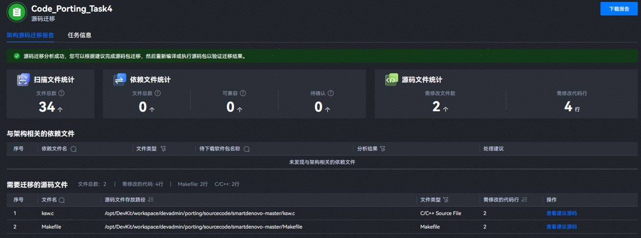 从图 迁移报告提供的依赖库信息看,该源码包不依赖于基本环境(OS环境基本的安装依赖,如Glibc等)外的其它依赖文件。