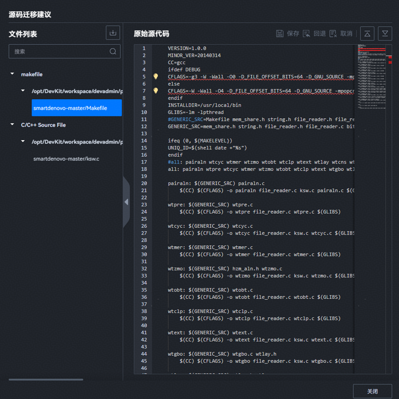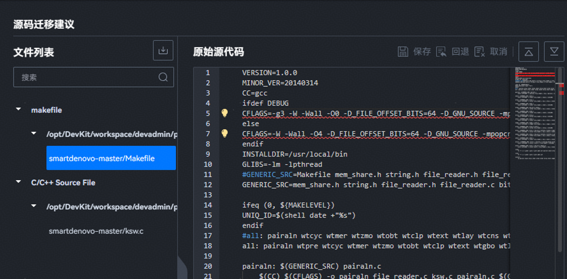 - 在“源码迁移建议”页面,查看Makefile文件的修改建议,如图所示。