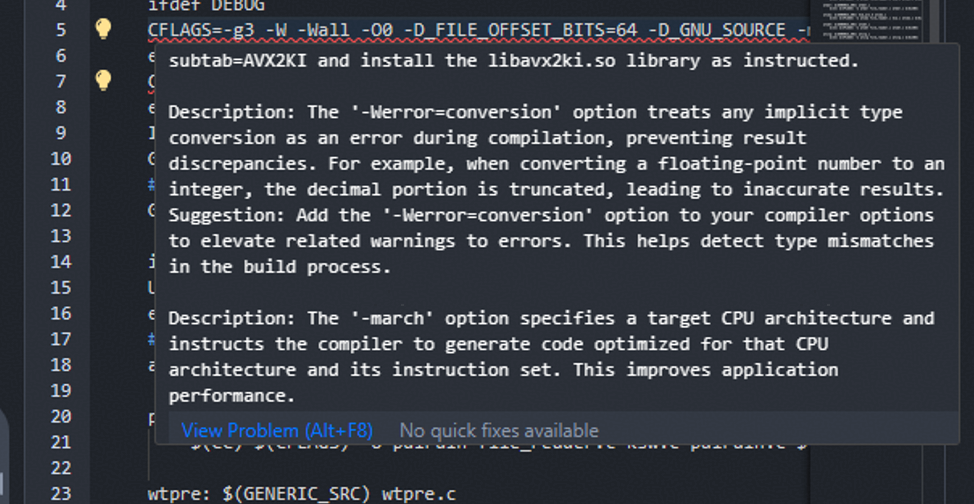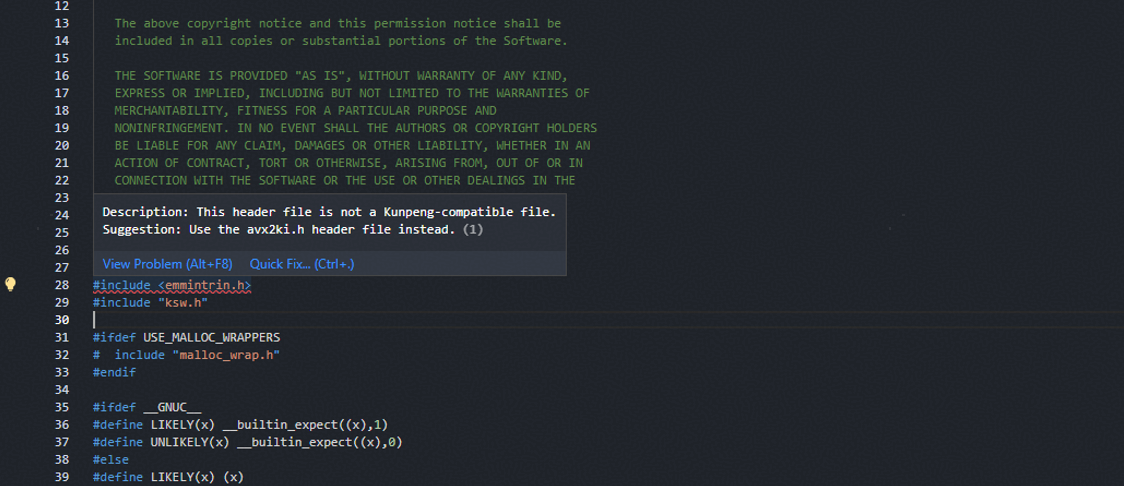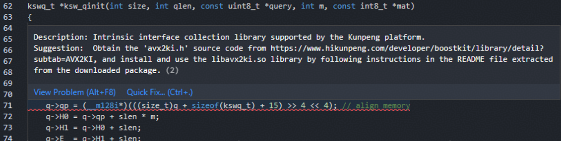 这种提示都是关于intrinsic函数使用方面的内容。根据提供的建议,单击“QuickFix”增加‘#include "avx2ki.h"’到ksw.c文件中,并针对x86和aarch64分别设置头文件包含的分支定义,以确保在代码同时适配x86和aarch64两种架构的情况下完成代码的修改,如下方回显内容所示(以编辑器版本GCC 4.8.5为例)。