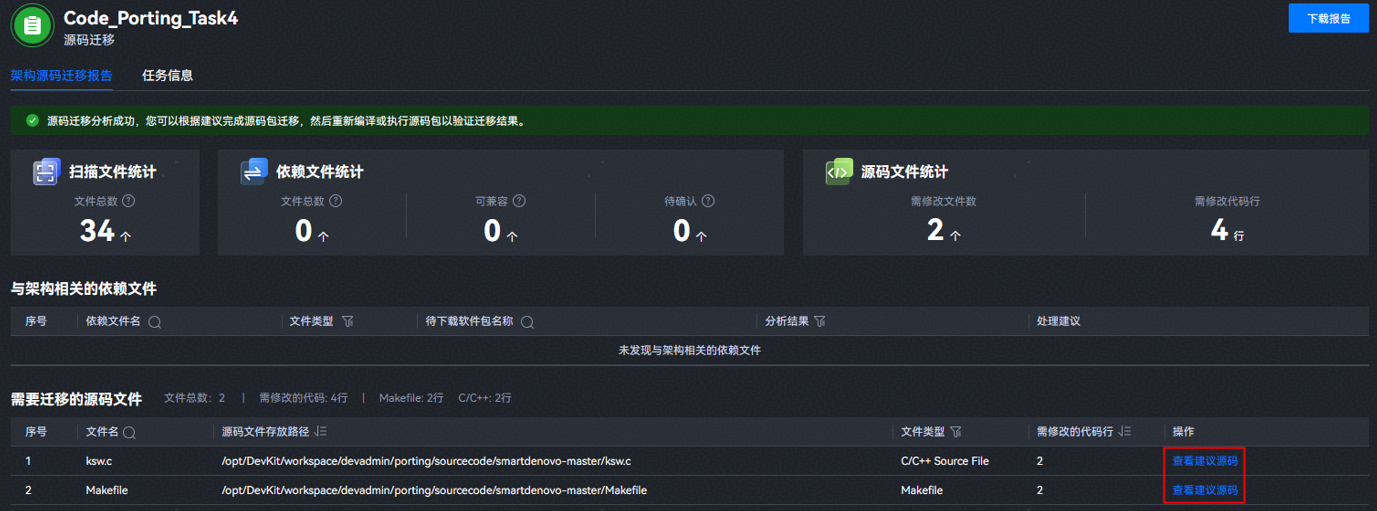 - 选择“需要迁移的源码文件”中不同的源码文件进行操作,即可切换至对应源码文件的迁移建议页面,如图所示。