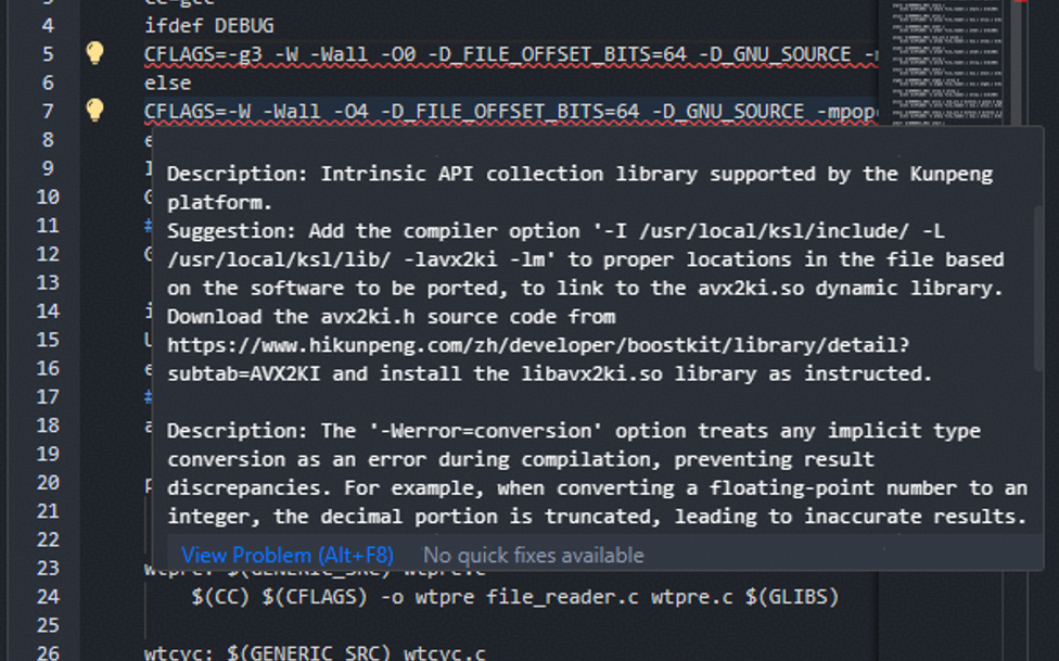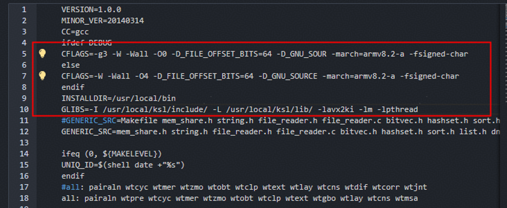 - 根据以上建议,Makefile文件中需要给CFLAGS变量增加选项内容“-march=armv8.2-a -fsigned-char”,同时,还需要删除CFLAGS变量中的选项“-mpopcnt”和“-msse3”。获取并安装鲲鹏系统库(BoostKit-ksl_2.3.1.zip)后,在GLIBS变量中添加“-I /usr/local/ksl/include/ -L /usr/local/ksl/lib/ -lavx2ki”。 修改后的代码(修改时进行了x86_64分支和aarch64分支的区分处理),如图所示。