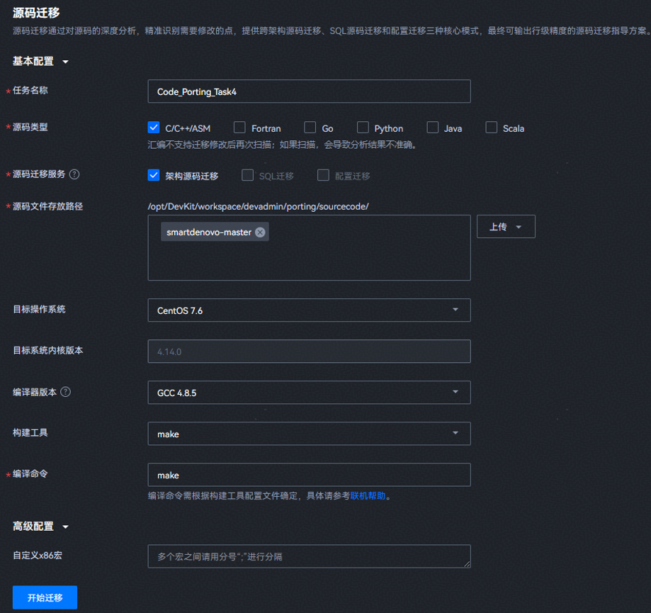 - 打开鲲鹏DevKit插件并登录鲲鹏DevKit工具,在左侧选择“源码迁移”进行扫描分析。上传smartdenovo-master文件夹压缩包,其它几个选项根据实际情况进行选择,如所示。