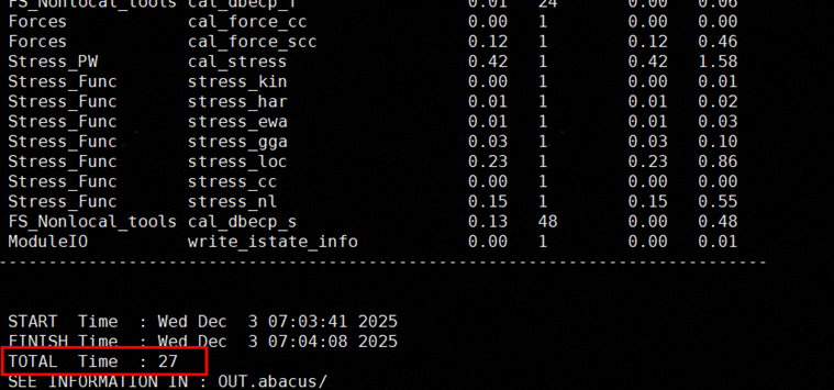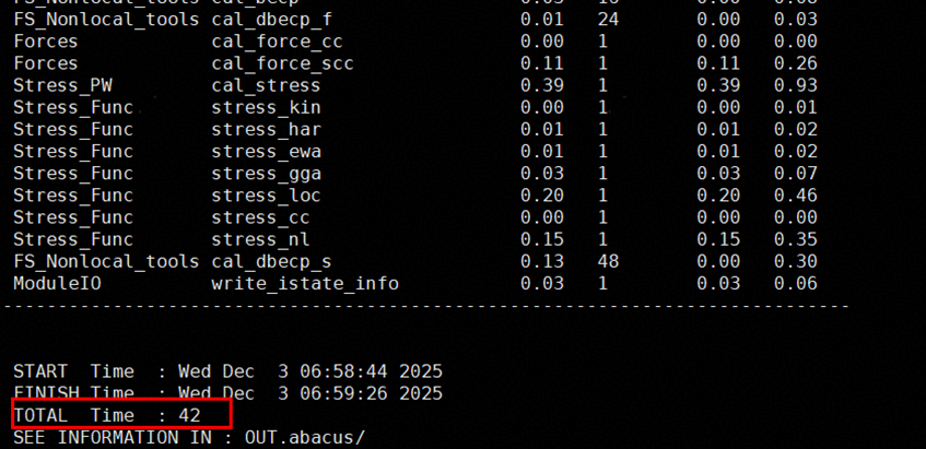 abacus应用运行P007_H2O_pw算例,测试基线时间为42s,使用DevKit矩阵化检查工具进行优化后,运行时间为28s,优化达到35.71%。