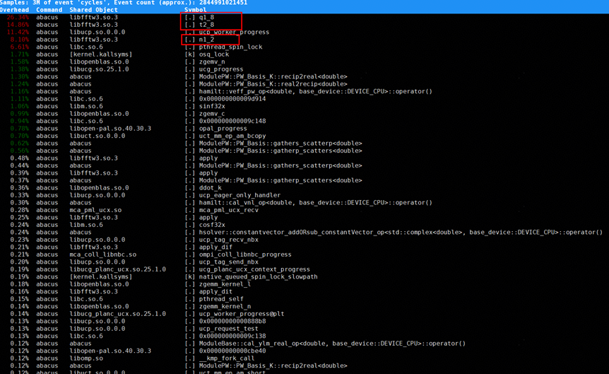以上为采集到的热点数据表格,其中,第一列Overhead为具体的热点占比数据,表示对应函数消耗的CPU时间占总CPU时间的百分比,最后一列Symbol为二进制模块中的符号名,其命名方式为模块名+函数名。