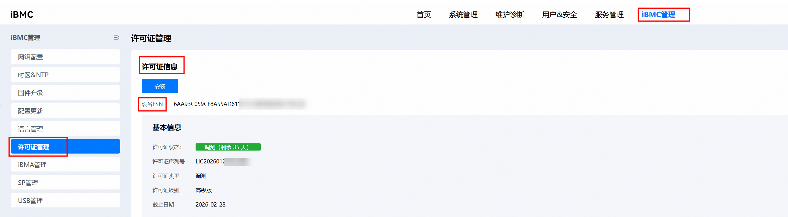 步骤1 登录iBMC网页,iBMC管理>许可证信息>设备ESN码。