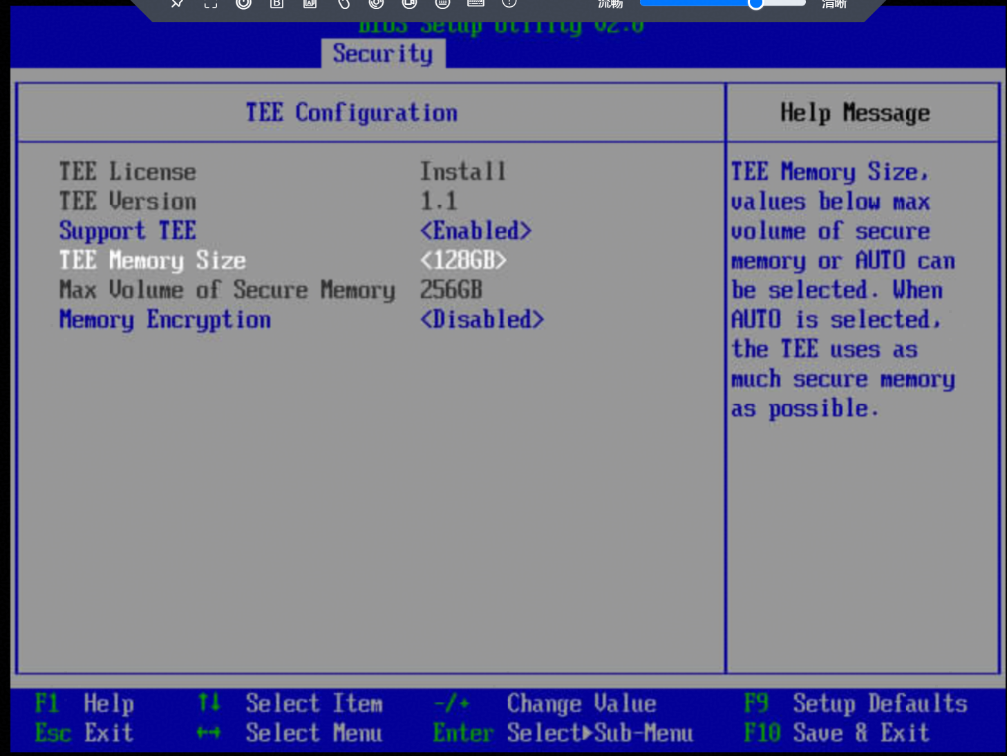当前TEE与BIOS特性"超线程","内存3路通道交织"不兼容,且TEE默认是关闭的。若需使用TEE,则需在BIOS菜单中关闭以上特性并打开"TEE Support"特性。