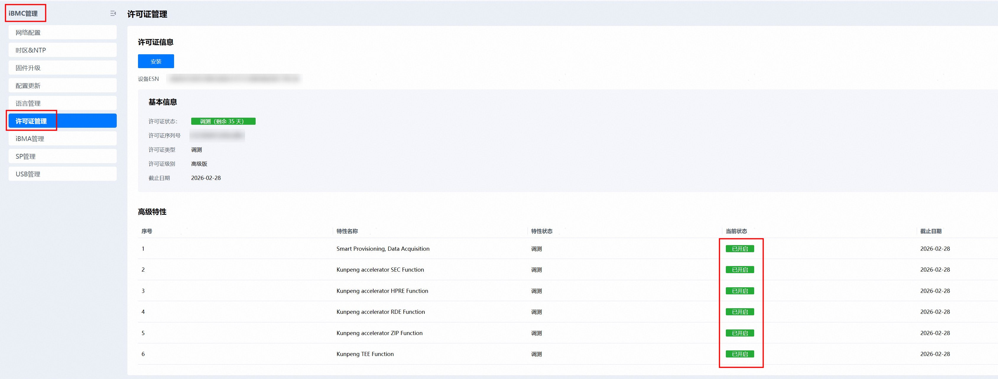 在特性使用前请确认iBMC许可证管理界面中“Kunpeng TEE Function”和“Kunpeng accelerator* Function”已处于开启状态。
