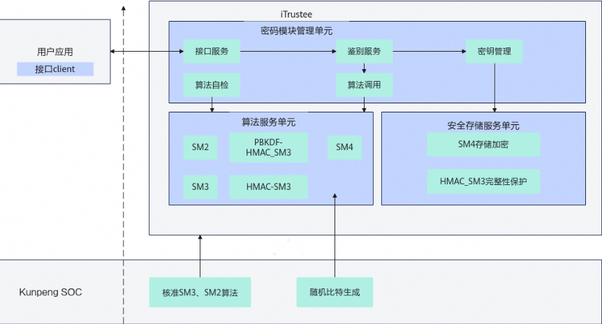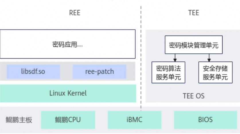 鲲鹏安全计算密码模块运行在华为自研的安全TEE OS基础之上,REE侧提供符合GM/T 0018-2012和2023标准规范的接口库文件libsdf.so,用户应用调用libsdf.so接口后,请求被转发到TEE侧,由密码模块管理单元进行处理,算法服务单元基于TEE OS底层实现具体的密码运算,安全存储服务单元提供数据加密保存。