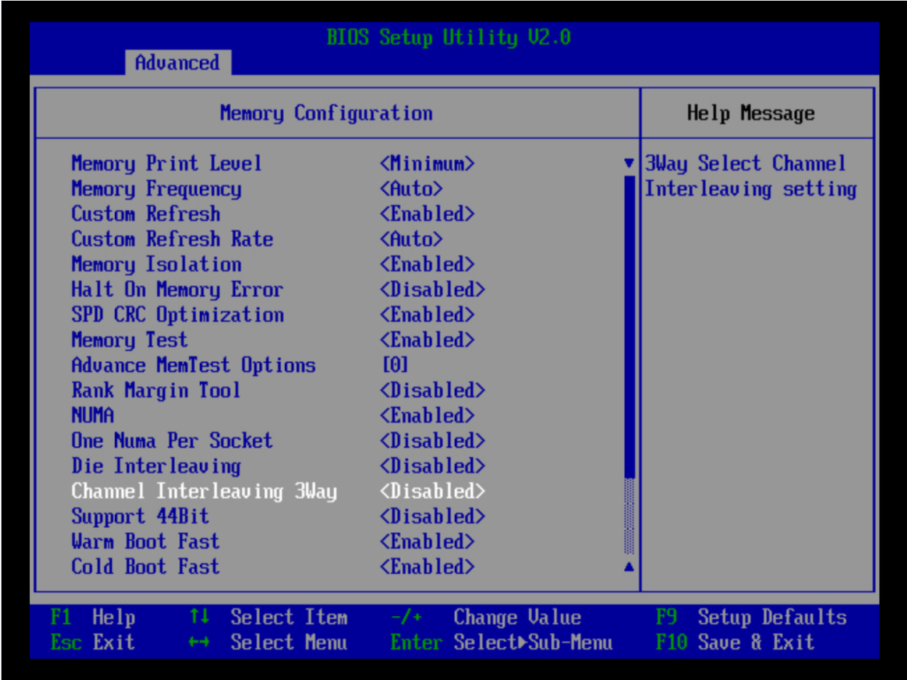 2. 在Memory Configuration界面,选择"Channel Interleaving 3Way",将其设置为"Disabled"。