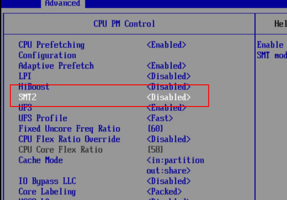 2. 在CPU PM Control界面将"SMT2"设置为"Disabled"。