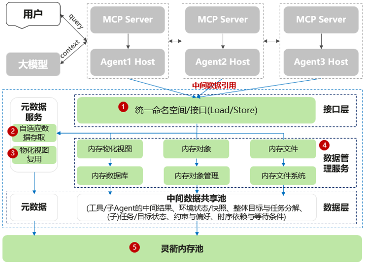 1. 统一命名空间:基于元数据服务,统一数据库、内存对象以及内存文件三种语义,确保数据引用唯一性,提供Load/Store接口,通过数据引用在大模型、Agent Host以及工具之间自由流动、按需加载。