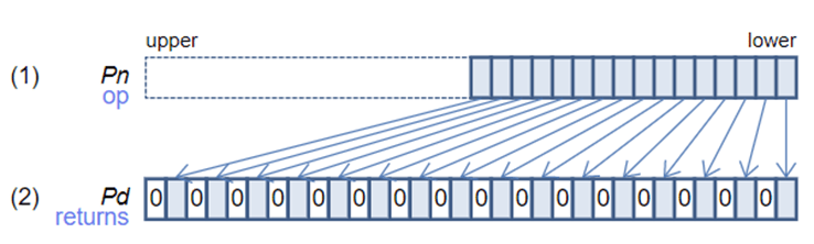 由于硬件设计,这些有效位根据向量中的元素数量均分,每段最低位生效,即P寄存器的有效位是不连续的。例如,处理32位元素时(8个元素),P寄存器的有效位是第0、4、8、12、16、20、24、28位(每4位取1位),其余位无效。这种分布方式是为了兼容不同元素宽度下的统一控制逻辑。